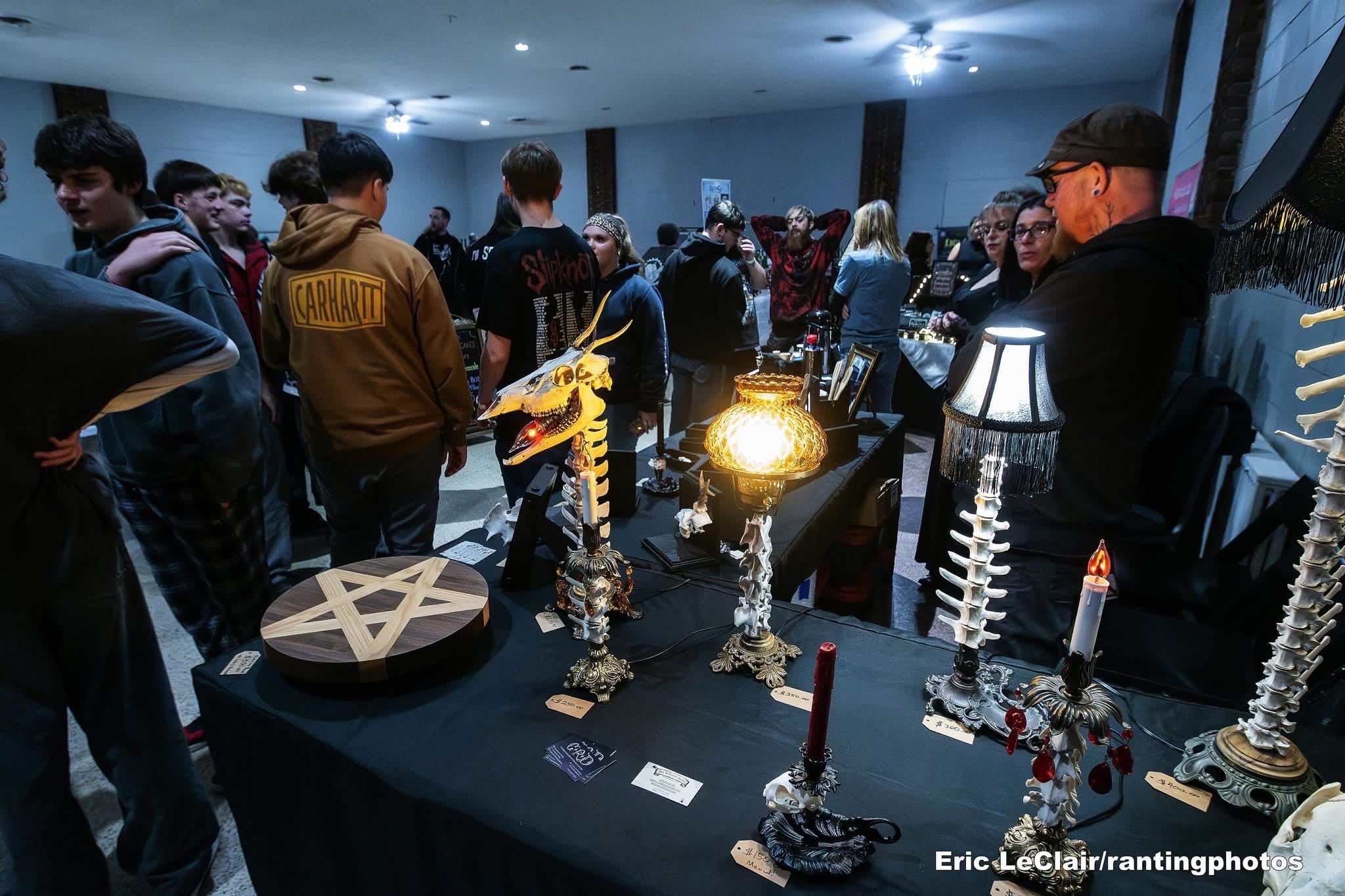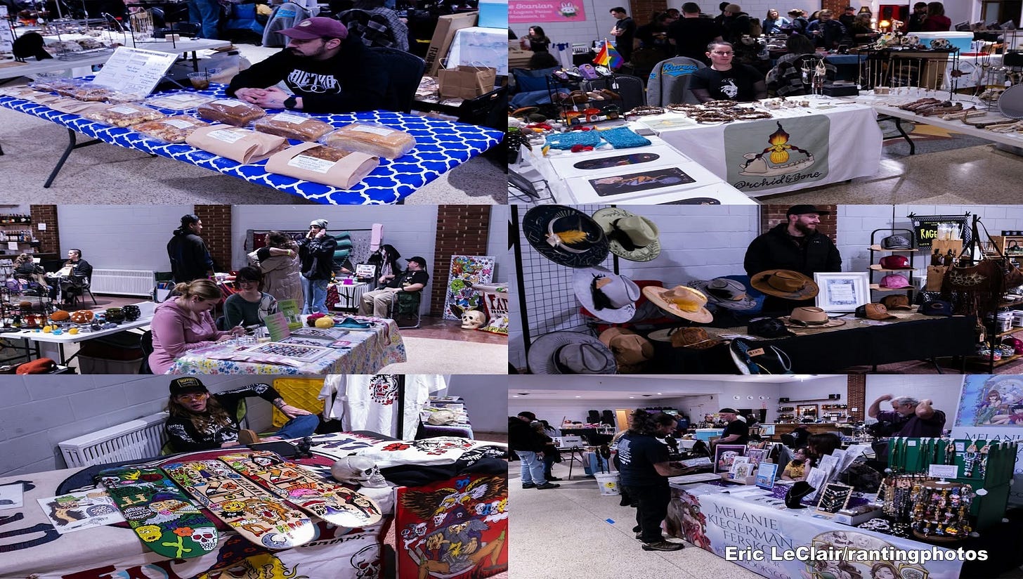 Between each set, I ventured upstairs to explore the diverse array of local vendors, artists, and artisans. Each one showcased their unique and creative creations. I purchased an emotional support pickle, some homemade and reusable hand warmers, and custom stickers. I wish I had brought more money because there was so much more to discover and purchase. From hand-painted skateboards, a pop-up tattoo station, coffee and cheesecakes, to handmade artwork, candles, hats, handmade esoteric items, and a pop-up record shop. There was tons of stuff here to look at and buy.