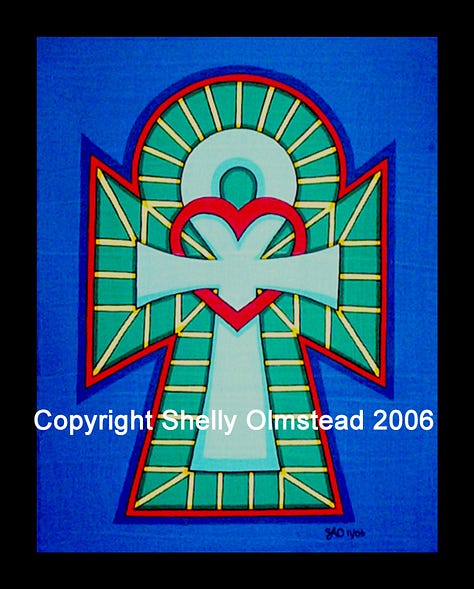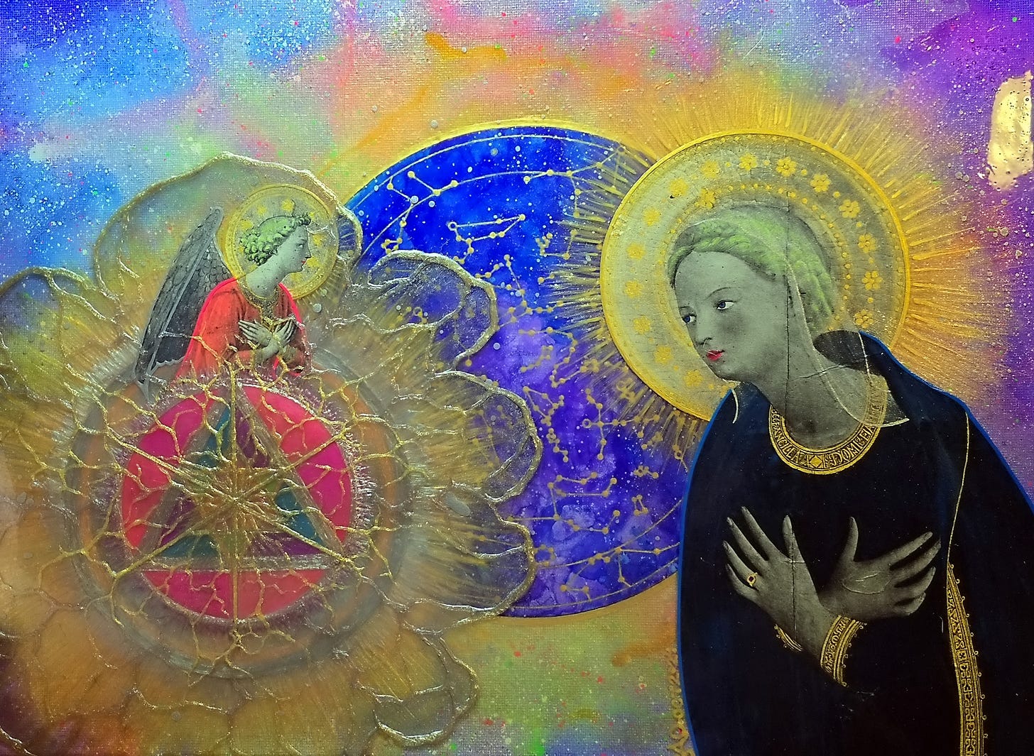 This one is called Across the Ages and I think this might be my favorite of all my artwork. I painted the canvas with splashes of Golden Artist Colors high flow acrylic paint and water, using it like watercolor and adding a bit of salt. Then I cut out a few images from books. The celestial map is from an old encyclopedia, the angel and madonna I cut out from a vintage Fra Angelico coffee table art book and I painted them in with Golden high flow acrylics. Then I layered them in between layers of Golden clear leveling gel with high flows and heavy gel medium. I also used some mica pigments mixed in with some of the gel medium. There’s a lot of layers, the merkebah I made using two different size printouts, layered with leveling gel then peeled off the back when dry to make a photo transfer then layered those on the canvas with layers of gel and color in between and on top. It took a lot of time, A LOT of drying time, but the outcome is so satisfying and I loved seeing the progress every time I finished a layer. Each layer is a different painting. The plasma around the merkabah is based on an orb I saw flying across the sky in Pueblo, CO July 2024 outside of the Blo Back Gallery when I traveled to help out with the Third Eye Carnival that summer that expanded into a large ball of plasma, then shrink back into an orb and continue traveling across the sky. I wanted to get that in some kind of art and it ended up working its way into this piece, which I began within a few weeks of getting back home from Colorado. I hand delivered it to its home in Chico, CA where I traveled in March 2025 to help out with the Maker’s Muse Festival at Maker Radio/Chico Fab Labs. It seems appropriate that it started with one event and ended in another place because of another event I helped plan. This was an experimental piece for me and now that I know what to do better and what not to do I’ll be ready for my next one which has already been started.