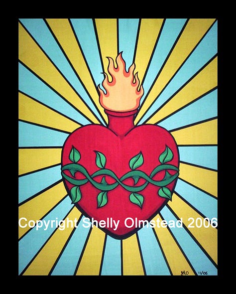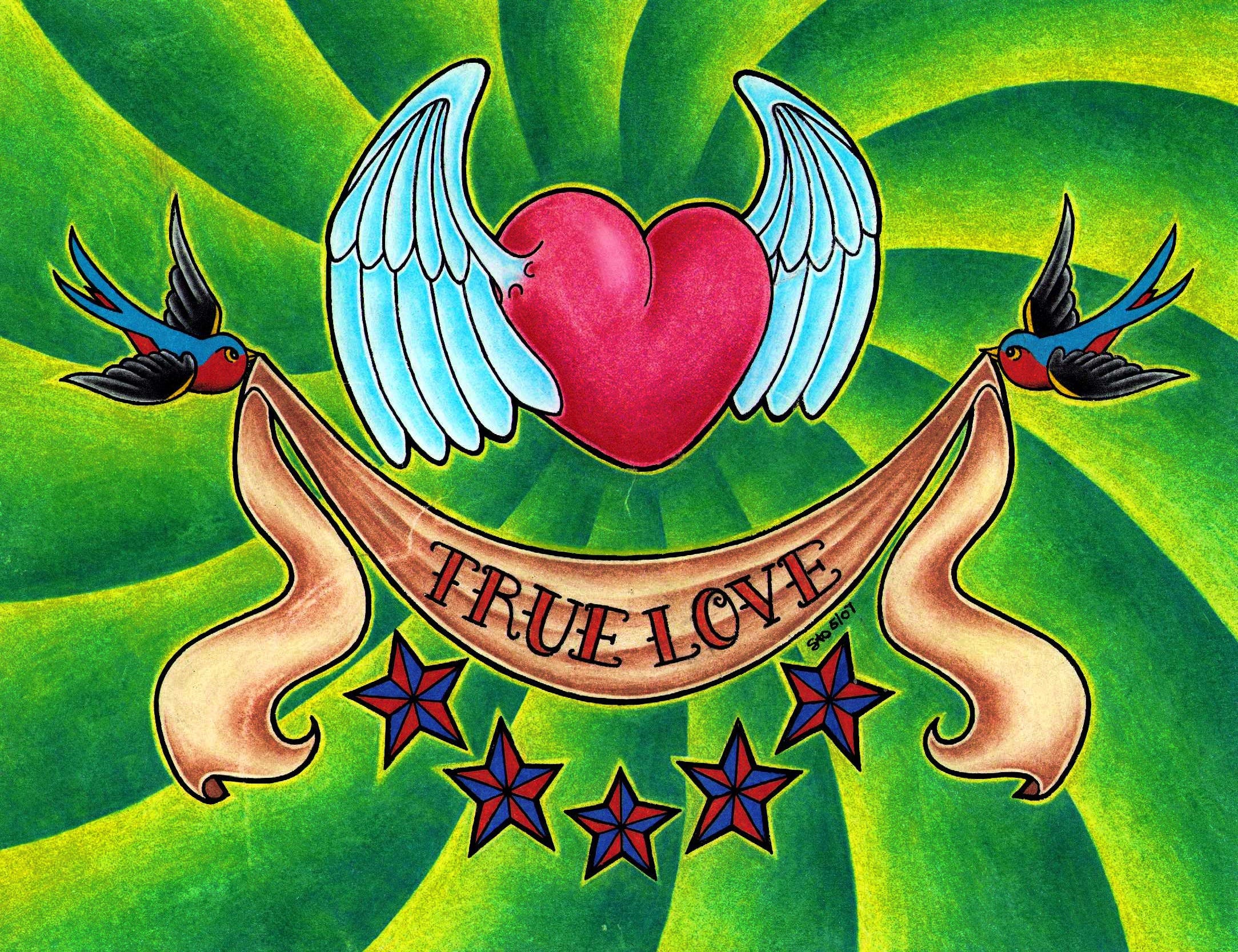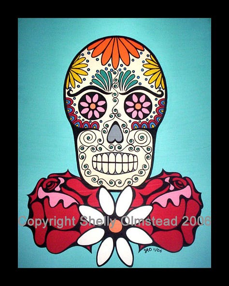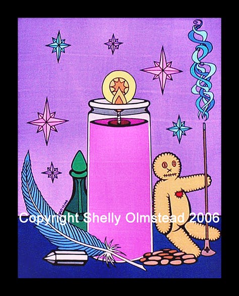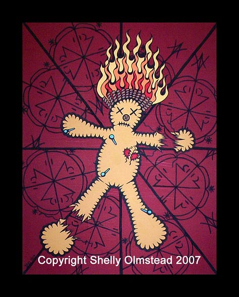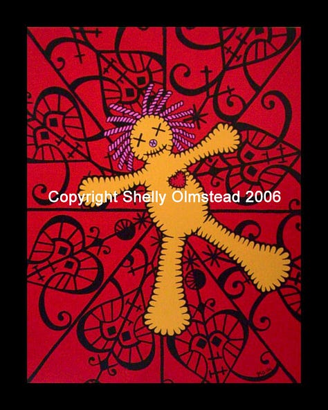The voodoo doll painting with the hearts, that’s called Voodoo Love. The symbol in the background is the veve for the Voodoo lwa Erzulie Freda. It’s the painting that got me my show so I drew my own version of the veve and got it tattooed on the inside of my left forearm. I was also taking Caribbean cultural anthropology courses at the time while my professor was writing a textbook on Caribbean folklore (Caribbean Folklore: A Handbook by Donald Hill) and asked if he could take a photo of it for the book as an example of the spread of Caribbean culture. He also loved my voodoo doll paintings so much he bought Voodoo Revenge and had it on display in the reception area of his office at SUNY Oneonta. Donald passed some years ago but I still think of him fondly.
