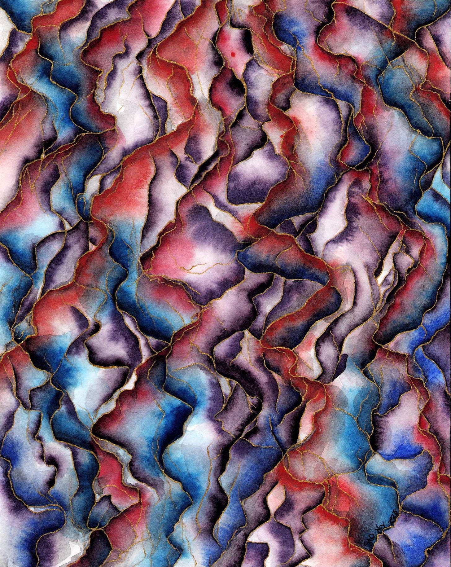 Another one of my more recent favorites is Vibrate. It’s a smaller piece, 8”x10”, done in Derwent water-soluble graphite pencil with Qor watercolors lined with handmade gold watercolors from Glimmery Watercolors (they’re legit, I love their watercolors, they’re beautifully pigmented and they’re very affordable especially for handmade watercolors!) on Blick hot press cotton watercolor paper. I see the vibration and color of music and sometimes it crackles like this so it was fun just letting loose and letting whatever comes out come out.