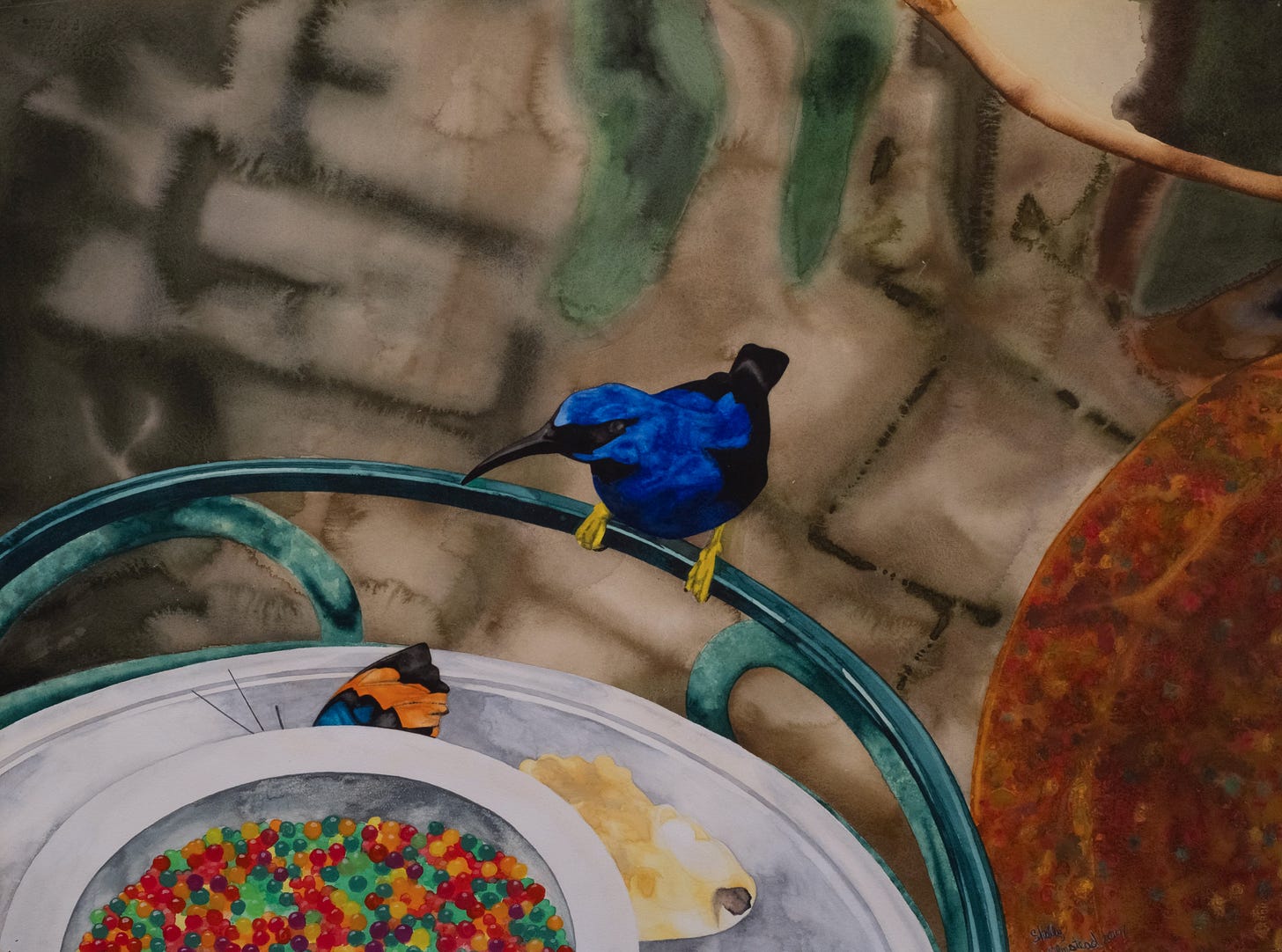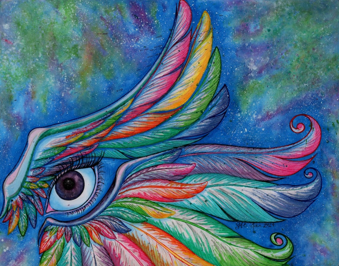 This one is called Angel Eye. I painted/drew this in 2024 with india and acrylic inks. I didn’t prepare for this one at all with sketches or anything. I just sat down, drew what was in my head in blue-tinted water and filled in the rest. I let the painting reveal itself as I went and that’s the process I prefer these days.